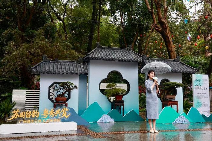 当世界午,行径在苏州评弹的婉转曲韵中拉开帷幕。越秀公园广场上,一组苏式园林造景将粉墙黛瓦、园林花窗、古朴盆景浓缩于一方寰宇,与越秀山的当然春色逸趣横生,仿佛将园林一角移入羊城。