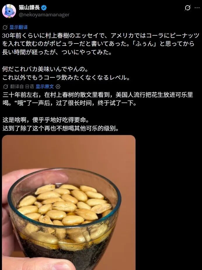 一位日本网友晒出我方在可乐杯里洒满烤花生的像片,宣称这是一种“好意思国流行服法”。他盛赞这种搭配好意思味到不成,达到了“从此再也不想喝其他可乐”的进度。