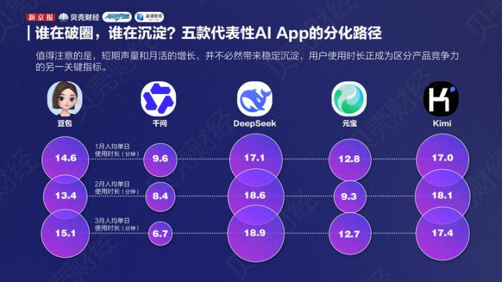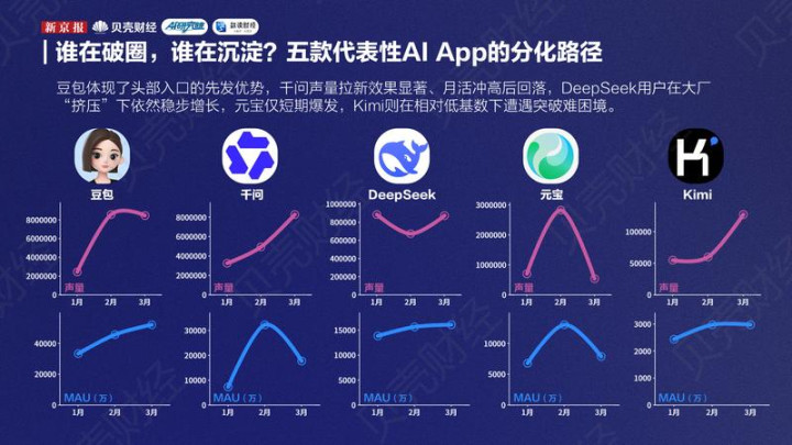 新京报贝壳财经记者梳理2026年3月的中国AI利用声量与月活数据发现,中国AI利用的头部梯队仍是初步造成——豆包、千问、DeepSeek、夸克、元宝五款家具在两项目的上都显著率先于其他利用。
