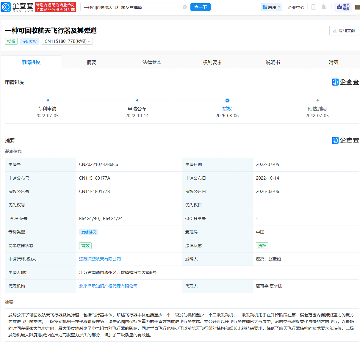 b体育官方app下载 深蓝航天苦求的可回收航天遨游器相关专利获授权