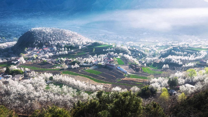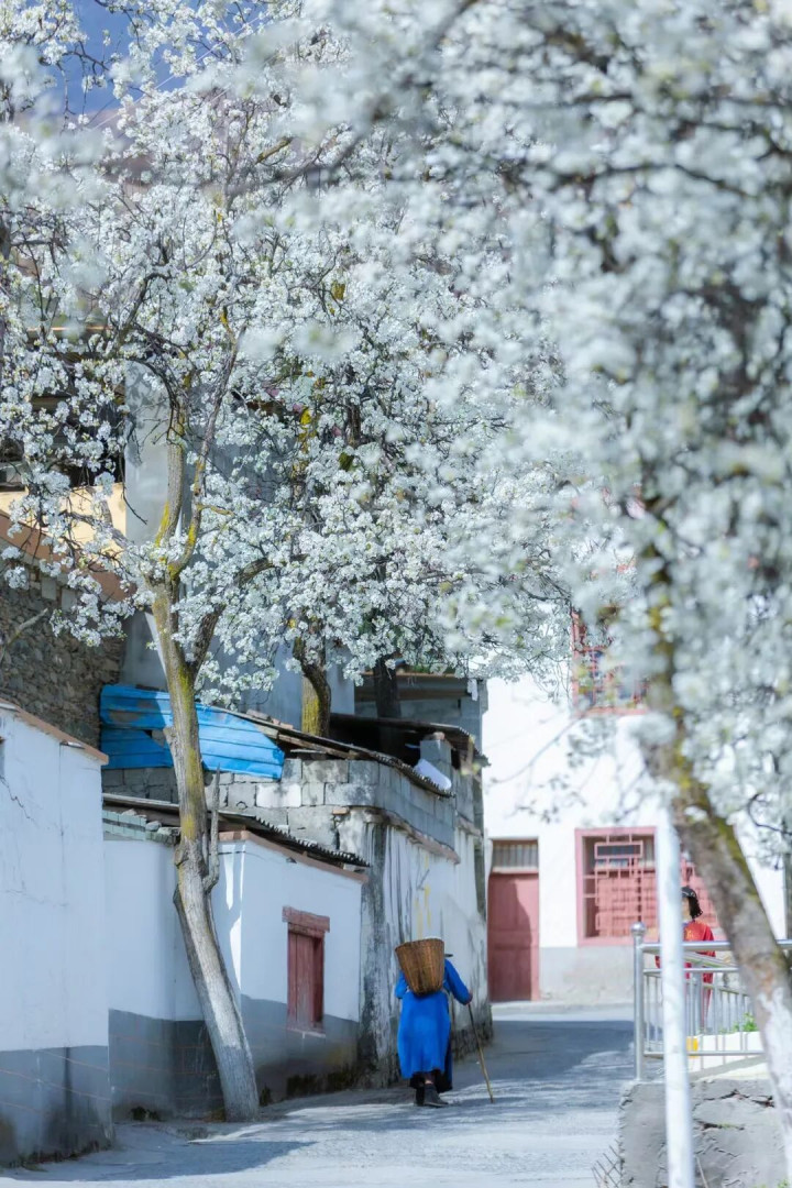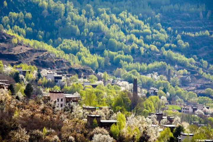 藏寨与河谷的梨花将汜博怒放
