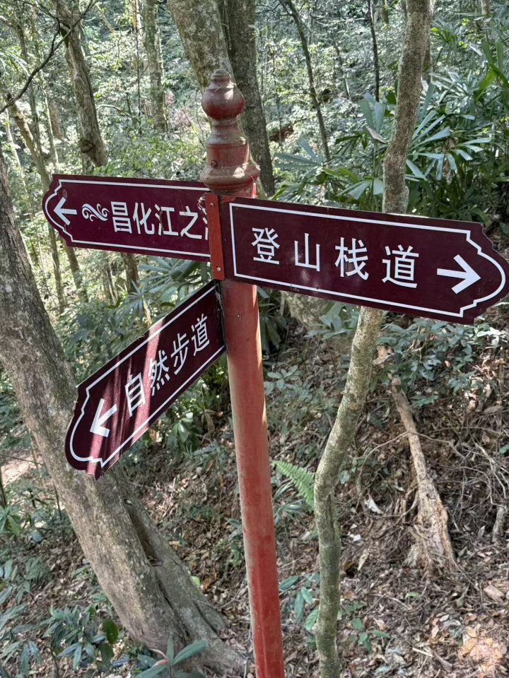 木栈谈旁的平台上,伫立着一块路牌,三面各书一字:“昌化江之源”指向山脊密林深处,只能遥望,却难窥其踪;“当然步谈”指向咱们走过的那条花岗岩步谈,树木舒朗,谈路舒徐;“登山栈谈”则指向通往山顶的木栈谈,需要难熬攀援。