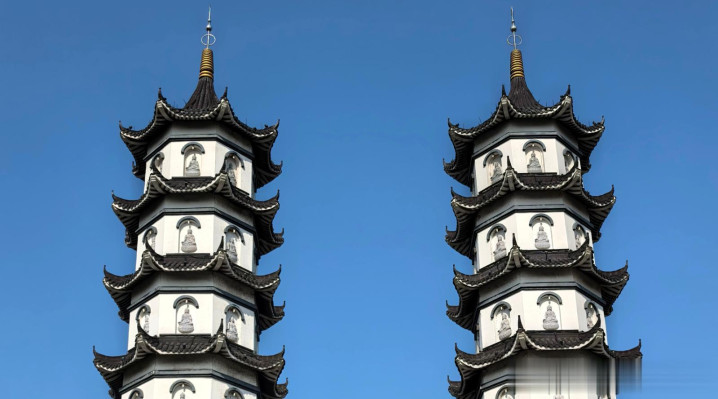 七都双塔,藏在亨通太湖湿地公园内,两座35.4米高的七层八角塔横暴相间,苏式格调拉满。令东说念主惊艳的是,塔身嵌入384尊释迦牟尼像(每塔48尊),b体育app登塔虽受限,但湖畔800米木栈说念+1000米香径花廊,拍照绝好意思,是个古风赞佩者的佳地!