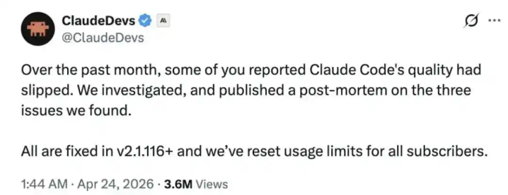4月23 日,OpenAI 在官网挂出 GPT-5.5。并吞天,Anthropic 又在官方博客发了一篇叫 “An update on recent Claude Code quality reports” 的事故复盘叙述,承认以前一个多月 Claude Code 如实变笨了——一个放新牌,一个补认错。但这位“新晋王者”险些是在自大:咱们承认 Claude 暂时变笨——但你别忘了,咱们手里还藏着一把 Mythos 没出。