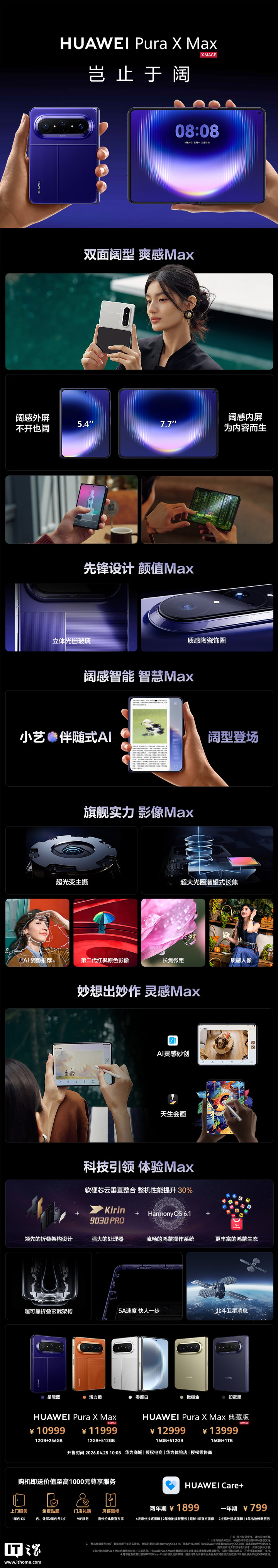 IT之家4月26日音讯,行业首款横向阔折叠手机——华为PuraXMax已于4月25日10:08精良开售,搭载麒麟9030Pro处分器,售价10999元起。