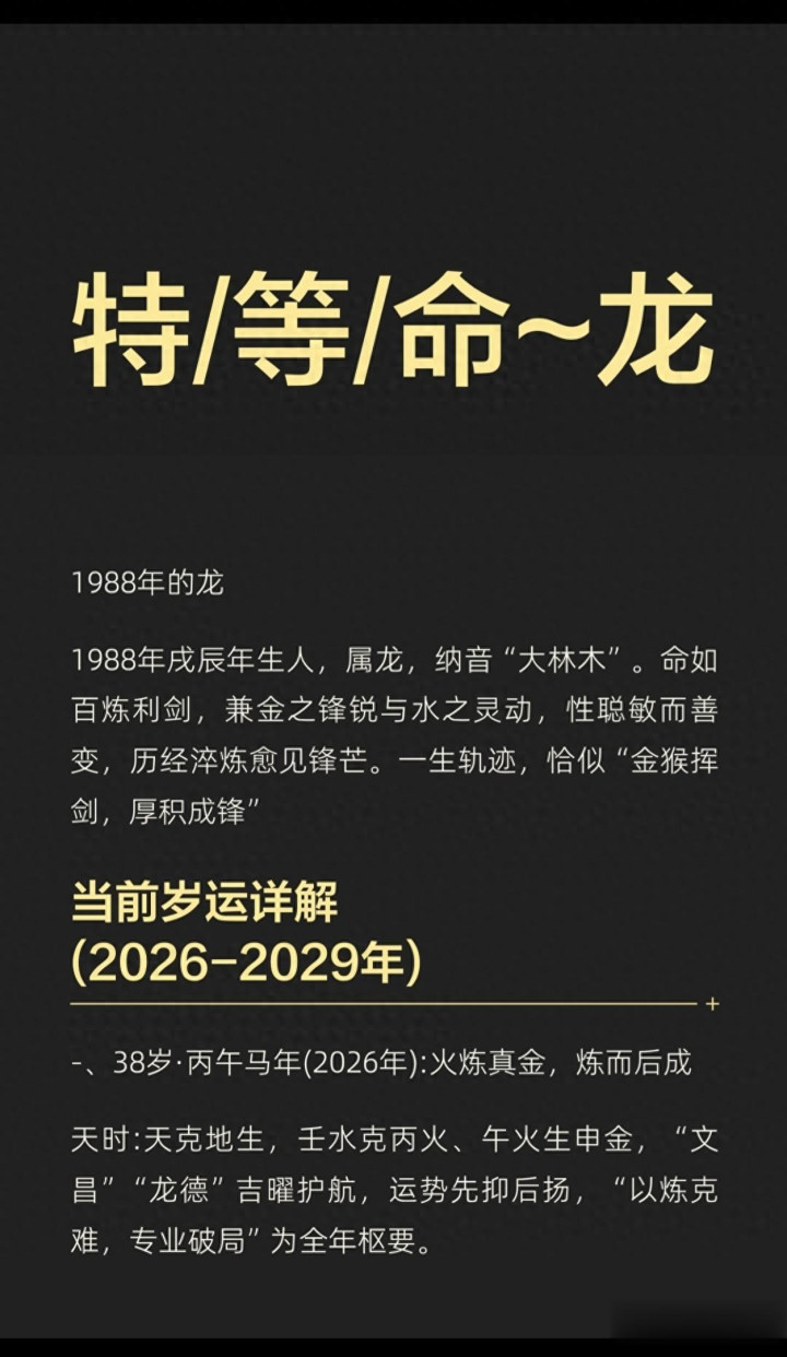 图片里说“命如百真金不怕火利剑,厚积成锋”,这不是夸口,这是我们的资质底色。1988年为戊辰年,纳音大林木,我们自带千里稳、强硬、可造栋梁的基因。